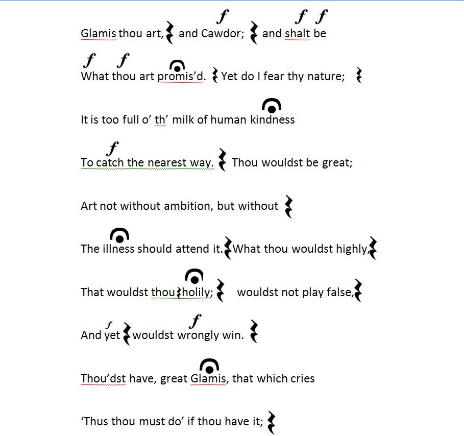 TASK: Using the symbols below, map out and then interpret the vocal dynamics of film and staged versions of Lady Macbeth’s first or second soliloquy. Then explain how delivering parts of the soliloquy in different settings – and in at least one case, a surprising setting – supports the text and contributes to the drama in the film versions. Finally stage your own interpretation of either soliloquy for your class and critique a partner’s rendition.