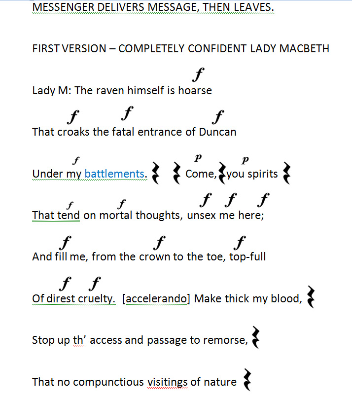NOW IT’S YOUR TURN TO CREATE A LADY MACBETH. ON THE FIFTH COPY, YOU WILL DECIDE WHICH WORDS SHOULD BE EMPHASIZED AND HOW BEST TO EMPHASIZE THEM. CHOOSE TEN LINES FROM EITHER PART OF LADY MACBETH’S FIRST SOLILOQUY TO PERFORM, THEN, USING THE SAME MUSICAL DYNAMICS SYMBOLS, MAP OUT (INDICATE) THE VOCAL DYNAMICS YOU WILL USE IN YOUR PERFORMANCE.