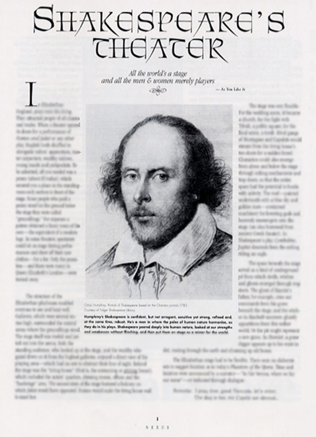 “True to the Renaissance focus on man, Shakespeare’s plays reflect the world of his time. His character Hamlet says the purpose of theater ‘is to hold…the mirror up to nature; to show virtue her own feature, scorn her own image, and the very age and body of the time his form and pressure.’ Shakespeare’s plays still mirror the world today. The politics in his history plays reflect what happens in the halls of Congress. The problems his characters wrestle with are our problems. And young lovers throughout the world still see themselves in his timeless love story, Romeo and Juliet…”