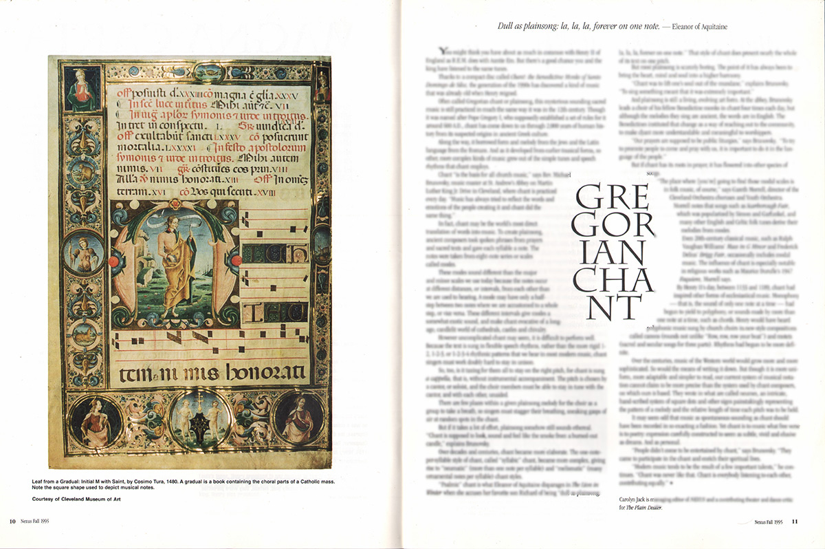 “Often called Gregorian chant or plainsong, this mysterious sounding sacred music is still practiced in much the same way as it was in the 12th century. Though it was named after Pope Gregory I, who supposedly established a set of rules for it around 600 A.D., chant has come down to us through 2000 years of human history from its suspected origins in ancient Greek culture. Along the way it borrowed form and melody from the Jews and the Latin language from the Romans. And as it developed from earlier musical forms, so other, more complex kinds of music grew out of the simple tunes and speech rhythms that chant employs…In fact chant may be the world’s most direct translation of words into music, To create plainsong, ancient composers took spoken phrases from prayers and sacred texts and gave each syllable a note. The notes were taken from eight-note series or scales called modes…”